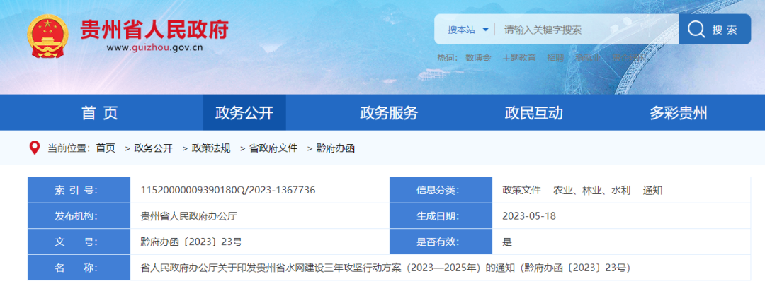 貴州省人民政府辦公廳關于印發(fā)貴州省水網(wǎng)建設三年攻堅行動方案(2023—2025年)的通知